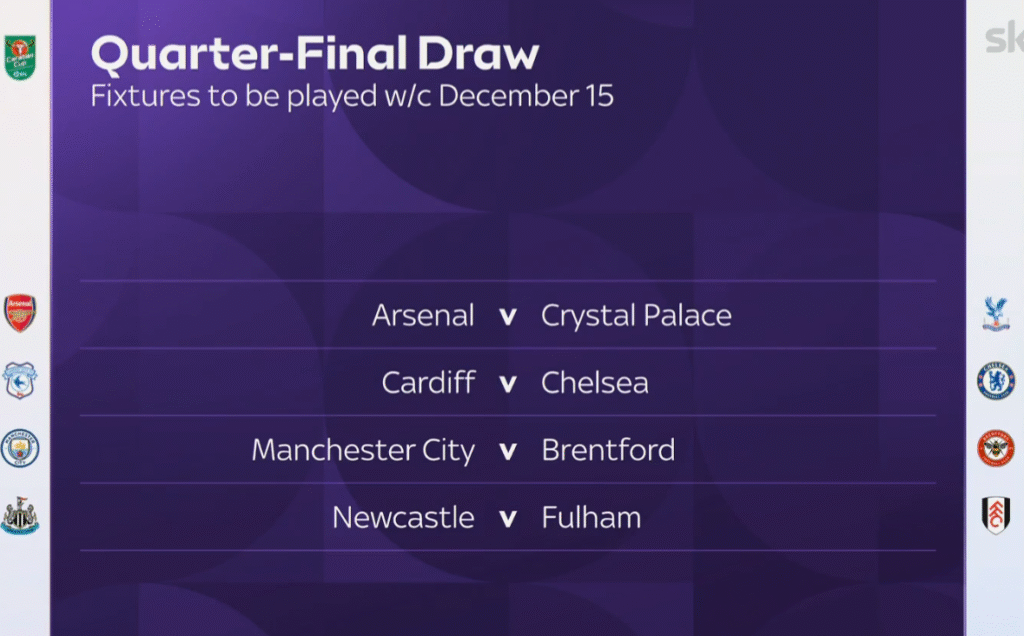 The quarter-final matches are: Arsenal – Crystal Palace, Cardiff – Chelsea, Manchester City – Brentford and Newcastle United – Fulham.